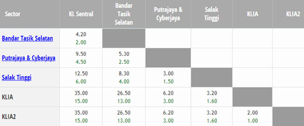 乘车地点请参看出发到达指南,以下为各站价目表(单位马币,分成人价和儿童价):